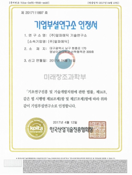 (주)알파메딕은 2014년 6월 13일 최초로 "연구전담부서"가 설립되었으며,